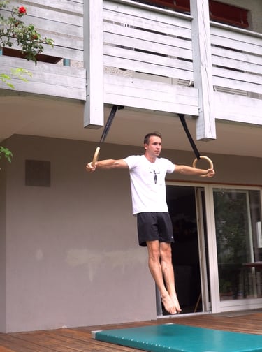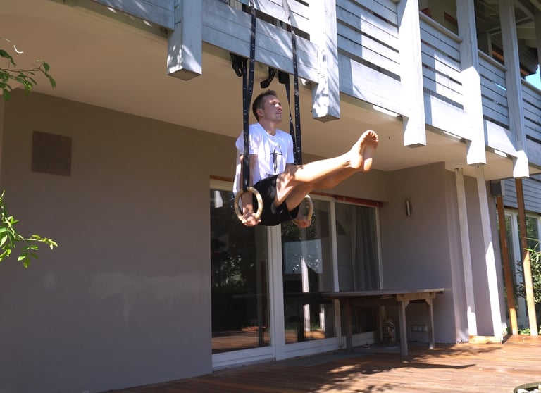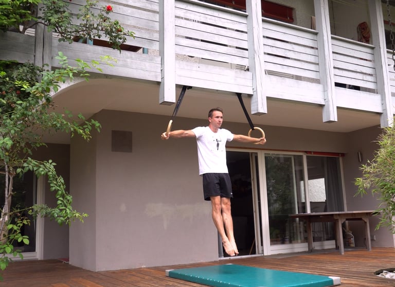Ich habe diesen Kurs zu einer Zeit entwickelt, als alle Turnhallen geschlossen waren. Mein Ziel war klar: Ich wollte mein professionelles Leistungsniveau halten – ohne Maschinen, nur mit Ringen.